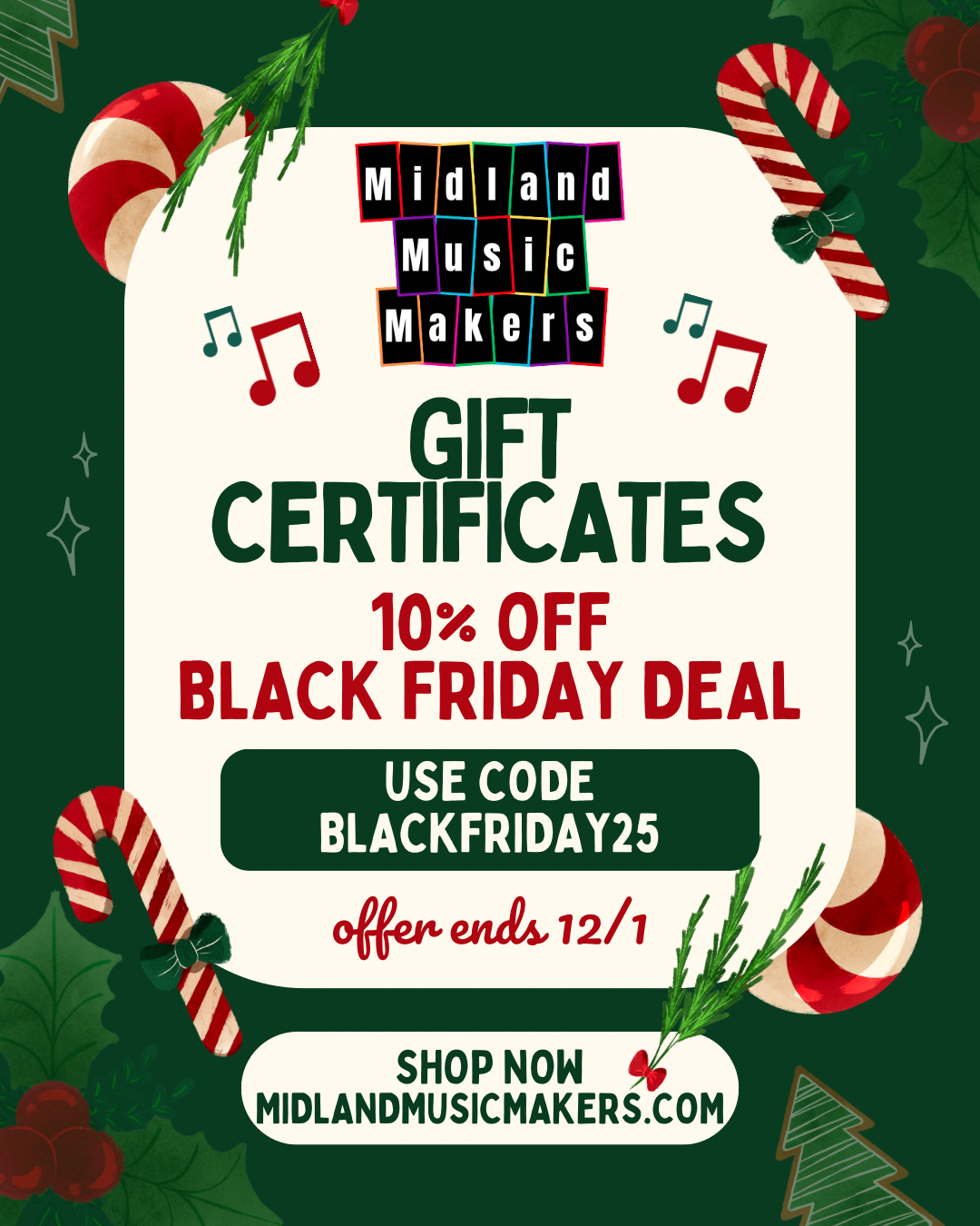 Gift Certificates may be purchased for between $5 - $335. Gift Certificates may ONLY be used at Midland Music Makers. Not redeemable at any other Music Together® center. Not redeemable for Music Together products. Not redeemable for cash. No refunds. To be used for Music Together regular semesters, Jingle Jam, and birthday parties at Midland Music Makers only. We will email your Gift Certificate to you after purchase for use to the email address you provide at checkout.